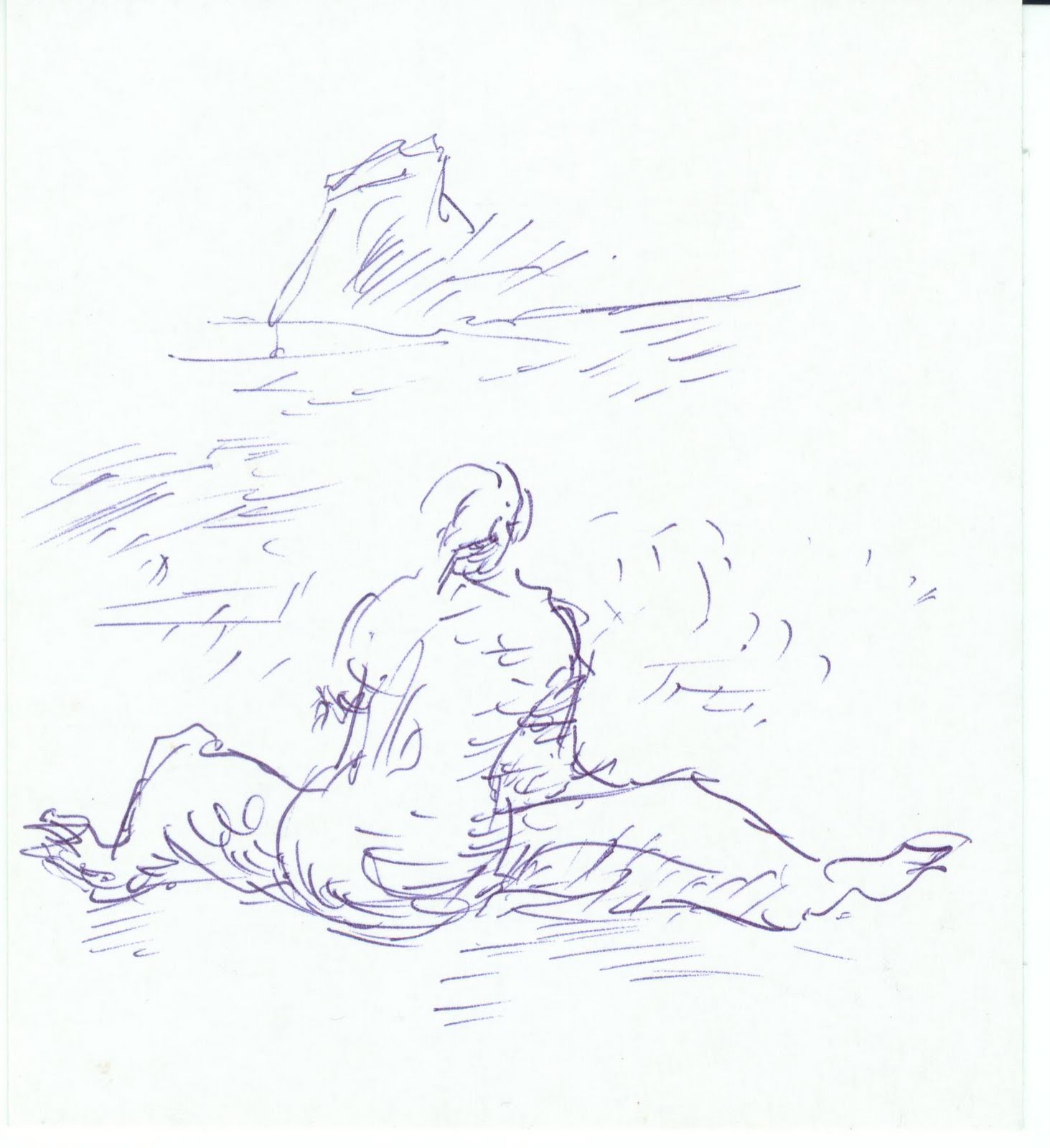 There is a small, rocky point just before you reach Pollok Beach - walking westwards - where the waves push through a narrow gap and, if large enough, send a spectacular shower of spray into the air. On the landward side, a lovely paddling pool has formed (with a little help from a man-made concrete wall). Anyway, it was here that, on a couple of occasions about a decade ago, we took our young children to play. And I managed to jot down a few sketches at the same time.